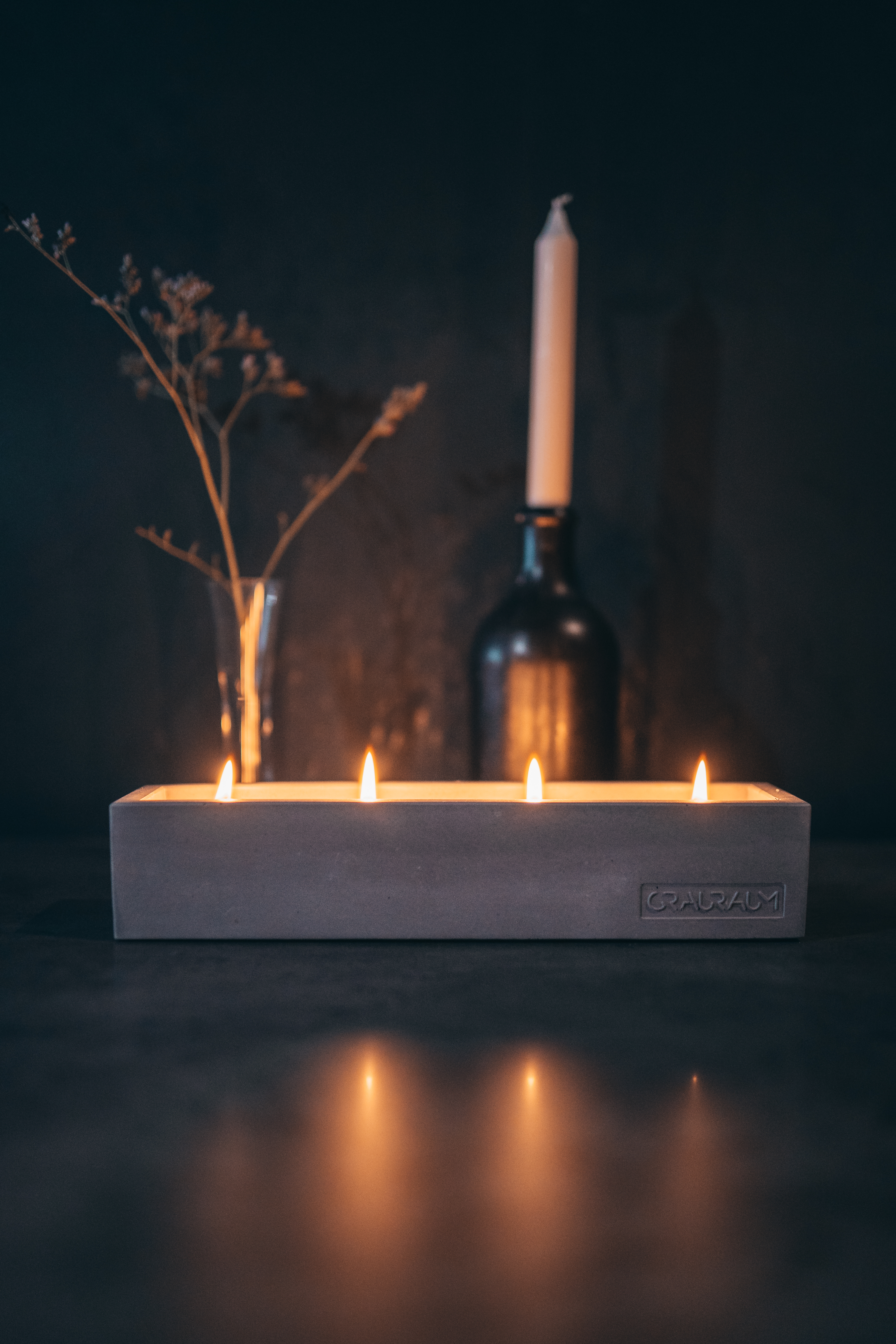 Nachhaltiges Wachs, gleichmäßige Flammen In unseren Betonkerzen kommt nachhaltiges Rapswachs aus Deutschland zum Einsatz. Bei den Indoor-Varianten unserer Kerzen kommt es dank des Dochts und des Rapswachses zu keiner Rauchentwicklung, zudem sind sie rußarm. Bei GRAUGRAUM gibt es außerdem Betonkerzen für den Außenbereich.