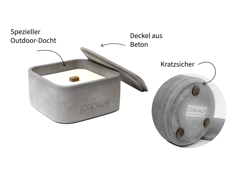 Unsere GRAURAUM-Kerze in einem massiven Betongefäß wurde in unserer Leipziger Manufaktur für Interiordesign & Kleinmöbel mit nachhaltigem Rapswachs von Hand gefertigt und verpackt. Jede Kerze ist also einzigartig – aber alle sind mit Filzgleitern ausgestattet, um Ihre Möbel vor Kratzern zu bewahren. Mit ihren Maßen von 16 x 16 x 8,5 cm, ihrem speziellen Docht, der jedem Wetter standhält, und ihrem schützenden Deckel ist die Kerze in quadratischem Design besonders für den Außenbereich geeignet. Nach dem Abbrennen lässt sich die Kerzenform mit neuem Rapswachs wieder aufgießen und für lange Zeit nutzen – eine nachhaltige Alternative zu herkömmlichen Kerzen.